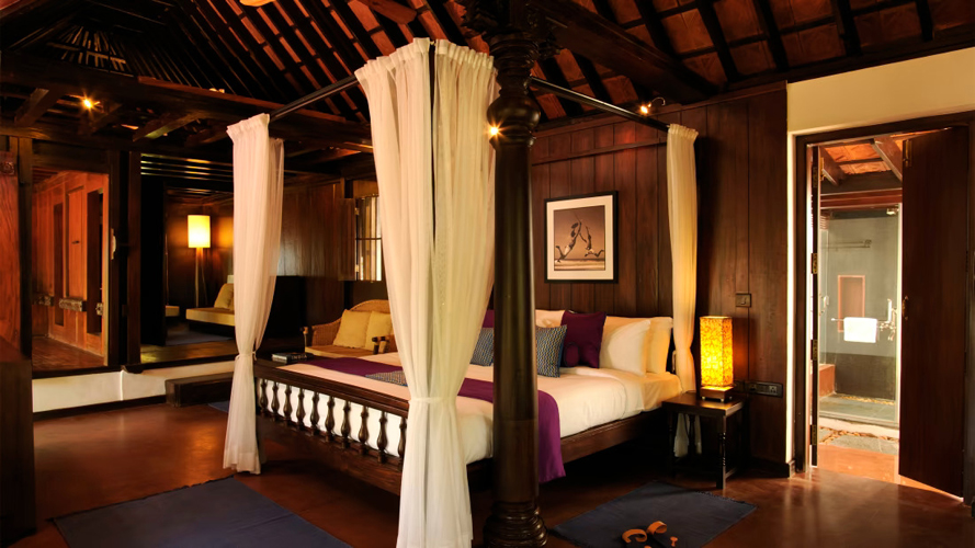 Heritage Premium Cottages, traditional yet luxurious, spacious, Kerala-style accommodations are designed with ornate doors, terracotta roofs, and carved pillars. They feature private sit-outs, open-to-sky rain showers.
