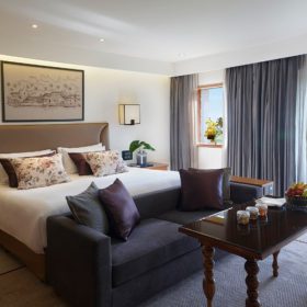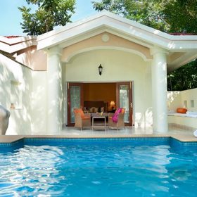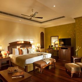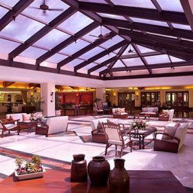 Taj Exotica Goa sprawls over 56 acres of lush greenery, and is divided into the main hotel building with large deluxe and luxury suites, and villa rooms. All this space coupled with old-world architecture, flower-lined patios and a sunshine-laden atrium make for a perfect romantic or family holiday.